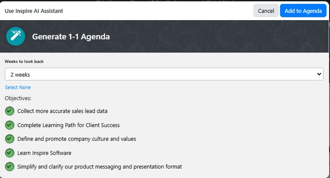 Tip: If your organization has AI Enabled for 1-1s - utilize the Inspire AI Assistant (Select Generate Agenda Summary With Inspire AI next to Suggestions within the Agenda Tab.
