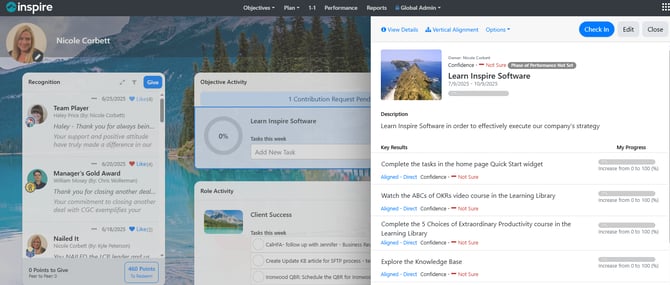 Clicking into your Objective from the Objective Activity Widget or My Objectives will open a Side panel. You can view its Vertical Alignment within this view.