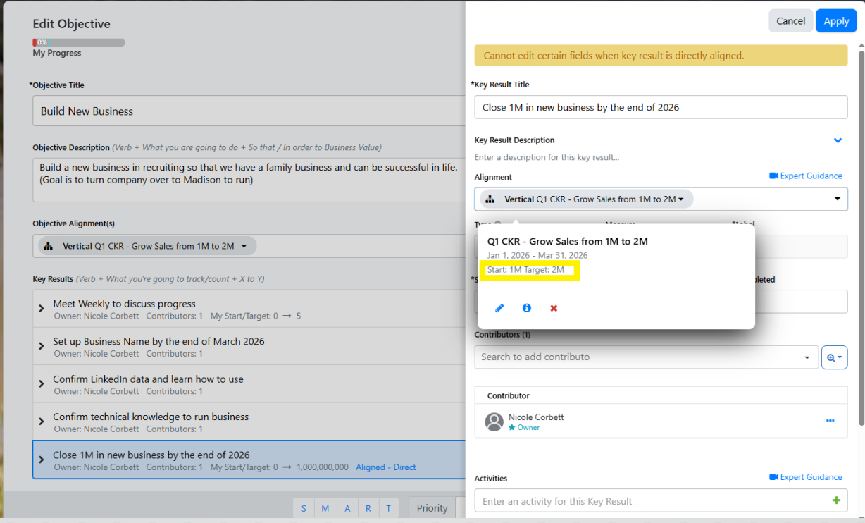 Note: When editing a Key Result and you have selected alignment to a Corporate Key Result (CKR), you can quickly view the CKR Start and Target values. Simply expand the alignment drop down to display this information.