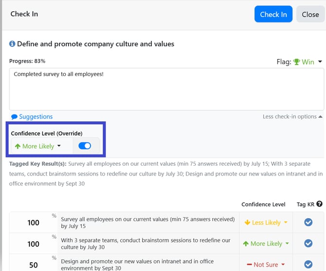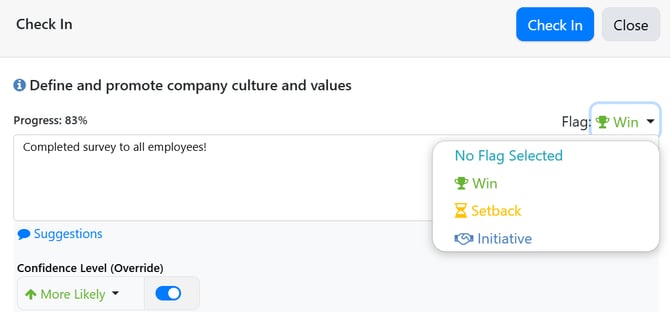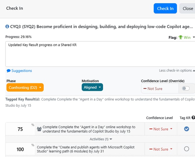 • Mark activities complete or incomplete from the Check In side panel, even if a KR is not measured by activity completion. When checking in, you can update the progress percentage on a single activity before it is fully complete.