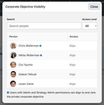 - When users go to align to the Strategy, they will see Corporate Objectives (CO) they are set as View or Align Access to. If a user is only set to View Access, they will see a yellow private icon next to it, and they won't be able to align to that CO.