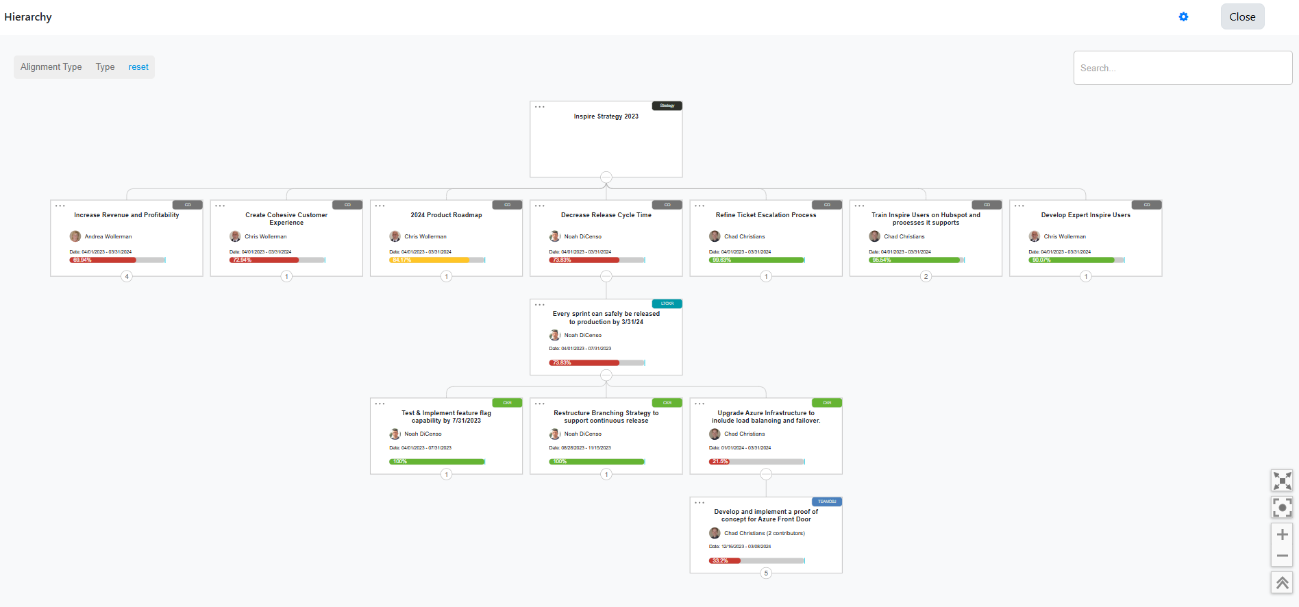 The Hierarchy View allows users to visualize the corporate strategy and its aligned objectives in a tree-style format. This view provides clarity on progress, ownership, and alignment.