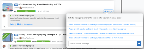 From the Newsfeed or an objective side panel, you can Nudge a user and send a notification requesting them to provide an update.