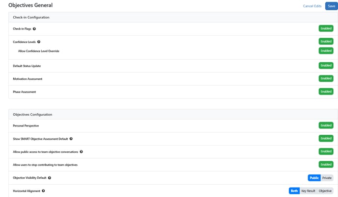 - Objective Visibility Default - Default to Public (If your Organization would rather have Objectives be set to Private by Default- Select Private). Best Practice is to have all Objectives set to Public and allow users to set Individual and Team Objectives to Private.