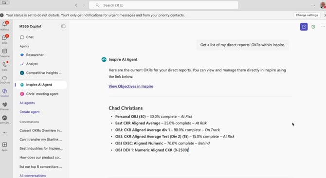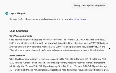 - Use prompts like Get my OKRs or Get my direct reports’ OKRs.