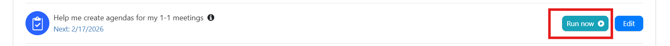 Note: You can run the 1-1 agent on demand by clicking on 'Run Now' to receive agenda(s) outside the scheduled agent cadence.
