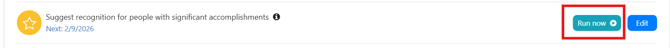 Note: You can run the Recognition AI agent on demand by clicking on 'Run Now' to receive suggestions for recognition outside the scheduled agent cadence.