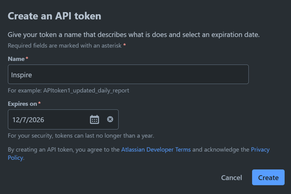 - Enter a token name (e.g., Inspire), select an expiration date, then click the Create button.