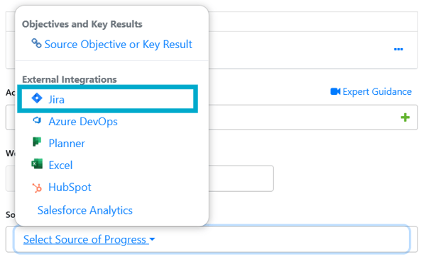 - At the bottom of the key result edit panel, open the Select Source of Progress menu, then select Jira from the list.