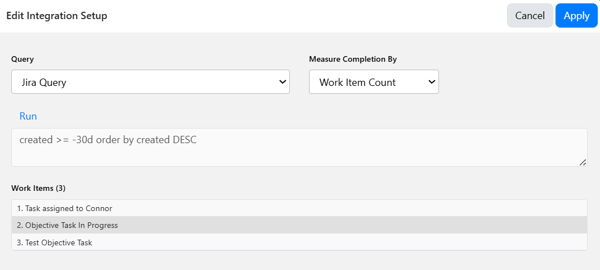 - Select Apply to save the integration. The Jira logo will display on the key result.