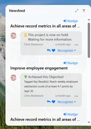 Stay up to date with your coworkers’ OKRs by viewing the Newsfeed from the Newsfeed Widget on your homepage or from the full Newsfeed page under Objectives.