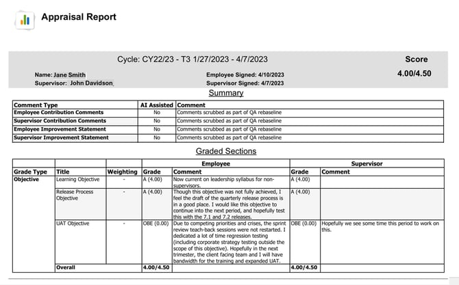 - Cycle Title, Name, Supervisor, Sign off Date(s), Overall Score, Contribution Comments, Improvement Comments, AI Assisted (Yes/No), 360 Contribution Comments, 360 Improvement Comments, Competency Title, Objective Title, Weighting, Employee Grade, Employee Comment, Supervisor Grade, Supervisor Comment.
