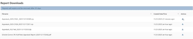 Performance Administrators have the ability to download user appraisals from a Performance Cycle or from an individual user's profile.