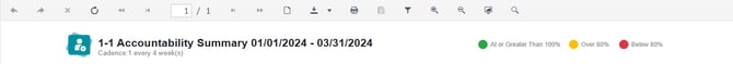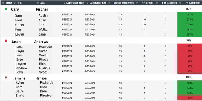 Details the number of 1-1 meetings held within a timeframe and calculates a Percentage complete based on the Organizations Settings in Administration.