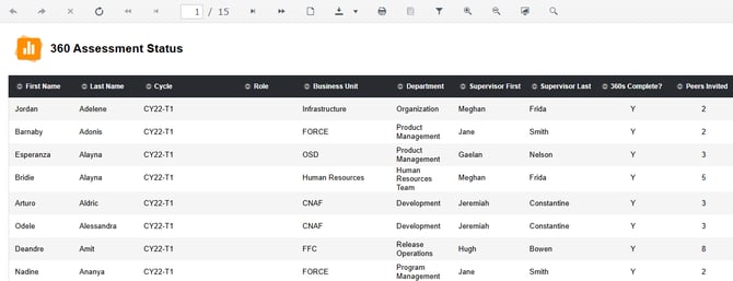 First Name, Last Name, Role, Business Unit, Department, Supervisor First Supervisor Last, 360s Complete? Peers Invited, Peers Required, Peers Complete, Peers Evaluated, Direct Reports, Direct Reports Required, Direct Reports Complete, Evaluated Supervisor?