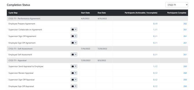 Includes details on who is complete or incomplete for each step in the Performance Cycle.