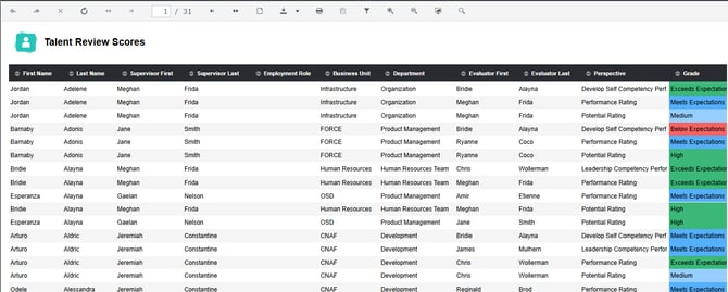 Includes: First Name, Last Name, Supervisor First, Supervisor Last, Employment Role, Business Unit, Department, Evaluator First, Evaluator Last, Perspective, Grade, Note.