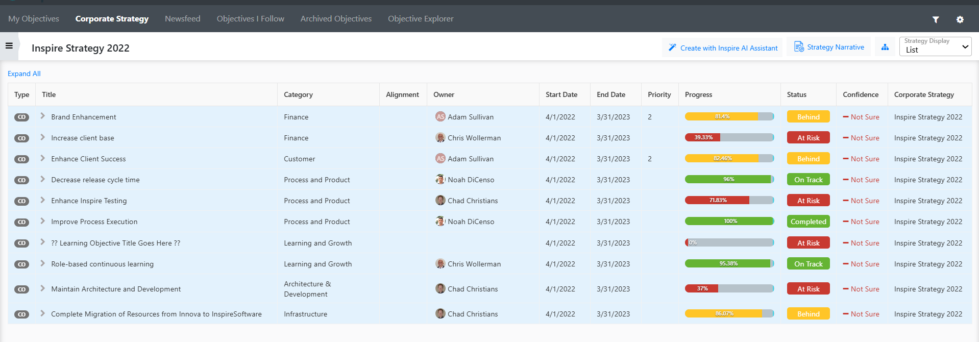 This view offers a nested list format of strategic items, starting from Corporate Objectives down to Team and Individual Objectives, giving users a comprehensive yet digestible way to review strategic alignment and performance.