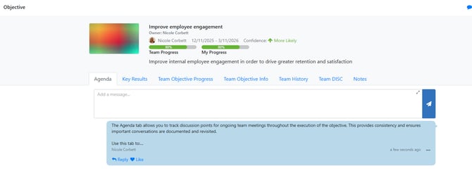 The Agenda tab allows you to track discussion points for ongoing team meetings throughout the execution of the objective. This provides consistency and ensures important conversations are documented and revisited.