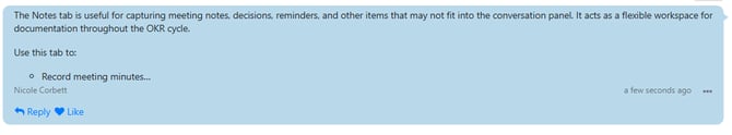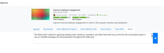 The Notes tab is useful for capturing meeting notes, decisions, reminders, and other items that may not fit into the conversation panel. It acts as a flexible workspace for documentation throughout the OKR cycle.