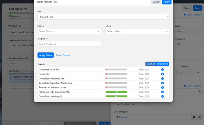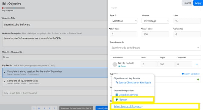 If your Organization has enabled the Planner Integration, this article will detail how to integrate Planner tasks with Key Results in Inspire.
