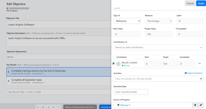 Note: If you add Planner to a Key Result, the Key Result will be locked down as a Percentage Key Result.