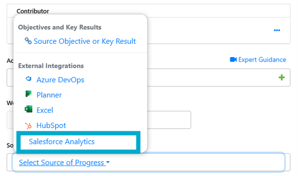 At the bottom of the panel, expand the Source of Progress menu and select Salesforce Analytics.