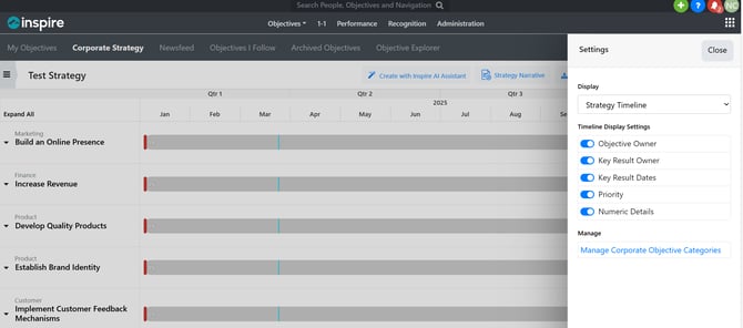 - When viewing the Corporate Strategy (timeline view) from the corporate strategy or timeline widget, if you expand the view settings (Gear icon) for the strategy, you can: