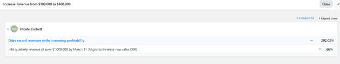 - Clicking on the People icon will bring up a drill-down of information on the users aligned to the Corporate Quarterly Key Result.